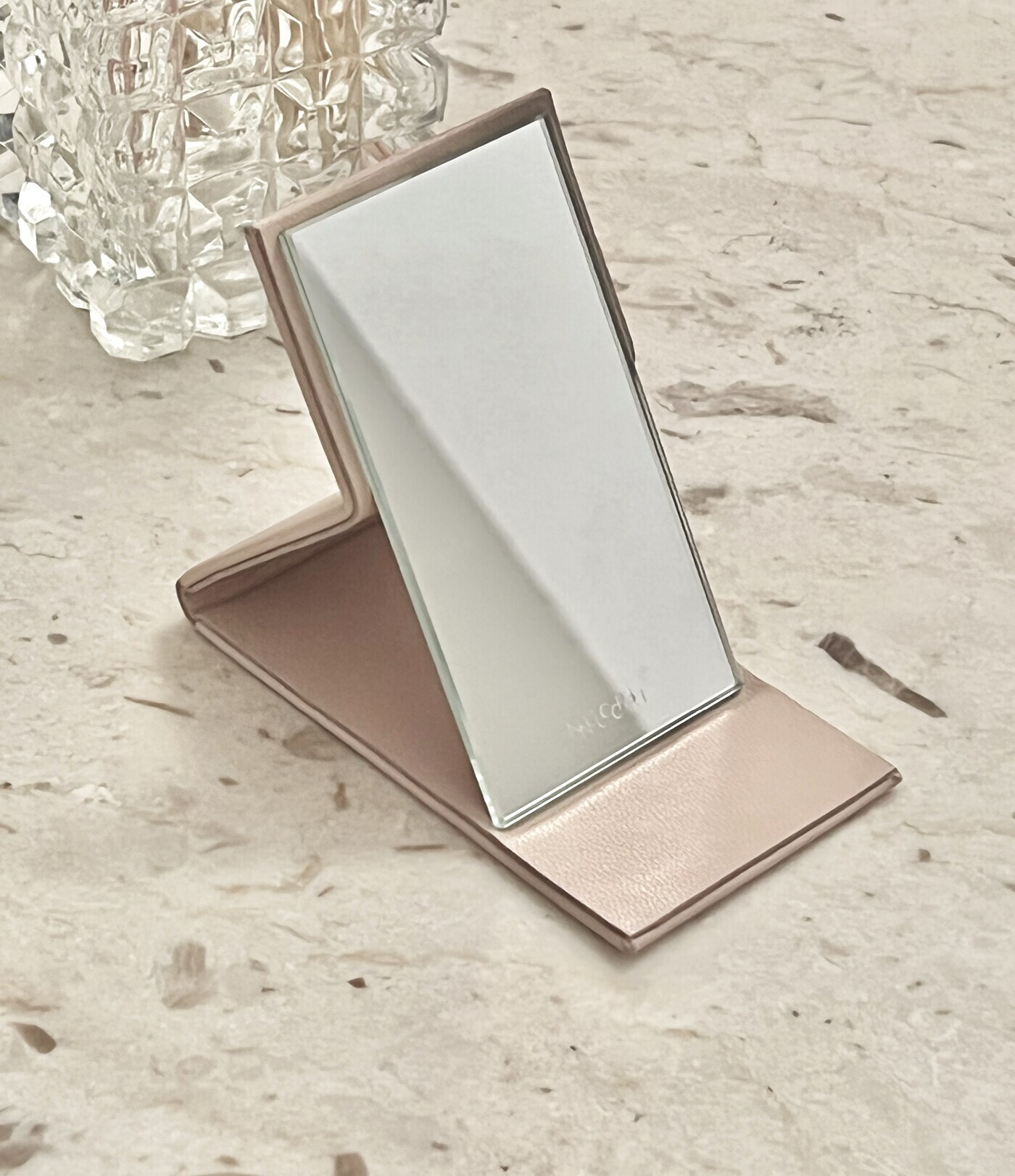 brushes, a sculpted soap dish, and a sleek pocket mirror—each designed to